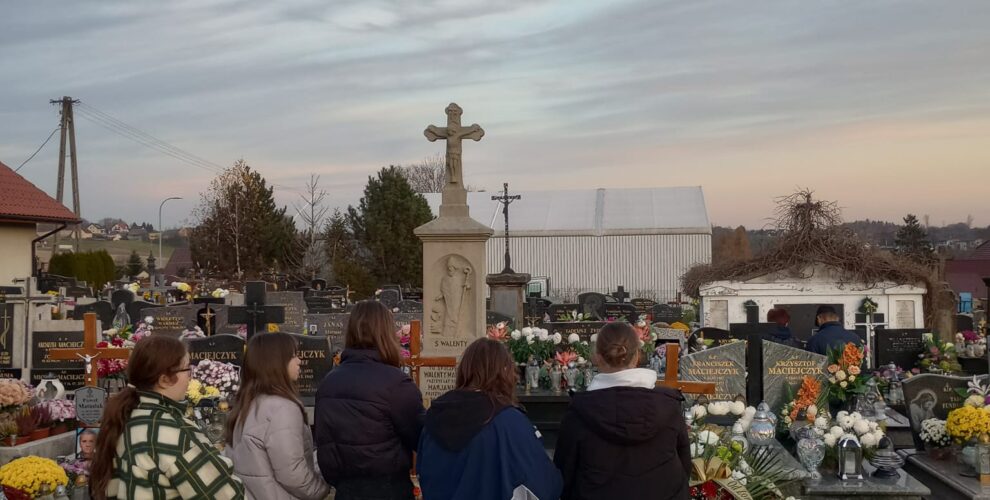 W dniu 14.11.2025 po zajęciach Wolontariusze wraz z opiekunem wybrali się na cmentarz we Frydrychowicach gdzie uporządkowali anonimowe nagrobki z krzyżami, zapalili znicze, odmówili modlitwę, uczcili pamięć zmarłych. Pobyt na cmentarzu wprowadził uczniów w nastrój refleksji i zadumy oraz wspomnień o najbliższych.