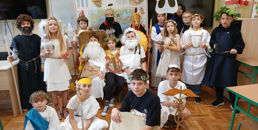 Na Olimpie….. Uczniowie klasy V uczestniczyli w wyjątkowej lekcji historii. Przenieśli się do starożytnej Grecji, a sala lekcyjna stała się swoistym Olimpem, na który przybyli bogowie greccy. Piątoklasiści wcielili się w bogów, przygotowali piękne stroje i krótkie informacje o nich. Pojawili się m.in. Zeus, Hermes, Ares, Artemida i Afrodyta. Uczniowie odwiedzili także dzieci z “zerówki”. Swoim wspaniałym wyglądem wzbudzili ogólną ciekawość. Gratuluję uczniom pomysłowości i twórczego podejścia do tematu.
