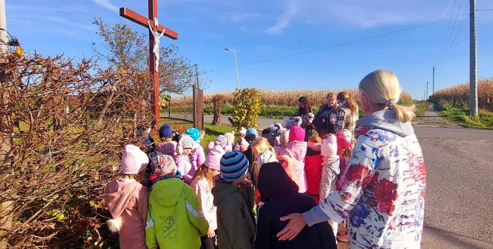 31 października dzieci ze wszystkich grup przedszkolnych wybrały się pod pobliski krzyż. Uczciliśmy to miejsce pamięci modlitwą oraz zapaleniem zniczy. Nie zabrakło również pamięci o naszych bliskich zmarłych – zbliża się bowiem Uroczystość Wszystkich Świętych oraz czas listopadowej zadumy. Takie wyjścia są ważnym elementem wychowania patriotycznego i pokazywania wartościowych postaw od najmłodszych lat.
