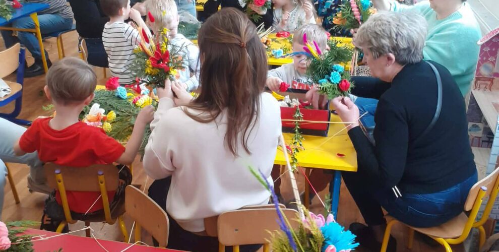 Tuż przed niedzielą palmową przedszkolaki z grupy “Kotki”, ” Żabki” i “Motylki” wraz z rodzicami wzięły udział w warsztatach robienia palm wielkanocnych. Celem zajęć było przybliżenie tradycji Świąt Wielkanocnych, integracja, rozwijanie wyobraźni. Z wielkim zapałem rodzice wraz z dziećmi wykonali piękne palmy wielkanocne. Na zajęciach panowała radosna atmosfera. Wszystkie palmy wyszły cudownie, a uczestnikom gratulujemy bogatej wyobraźni i kreatywności.